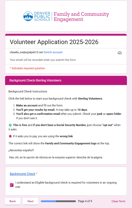 Please email Claudia Mejia at claudia_mejia@dpsk12.net once you have completed your background check and application, to be able check the portal for completion.